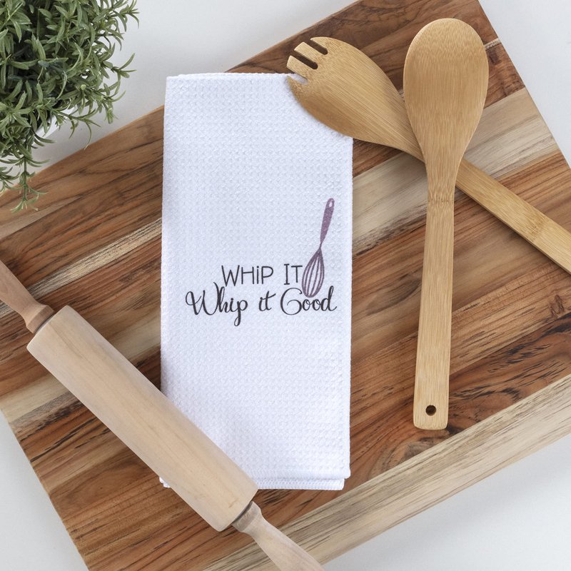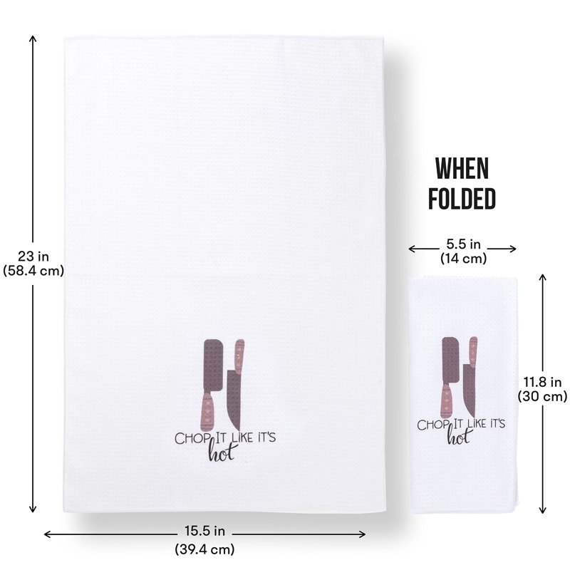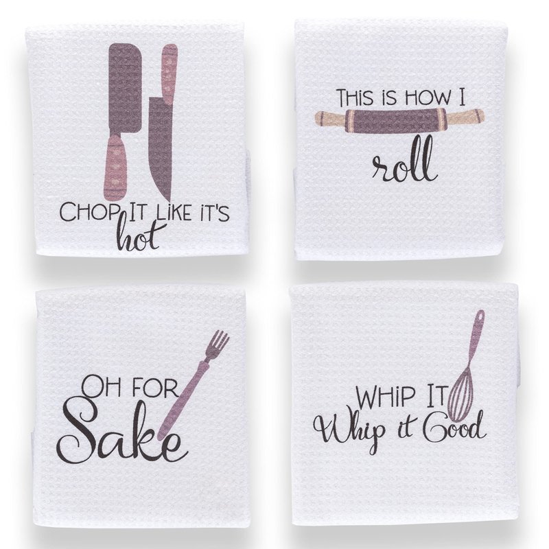 Disegni personalizzati: Ok, ok, sappiamo che probabilmente hai già sentito i giochi di parole, ma non hai ancora visto questa opera d'arte, perché le abbiamo fatte realizzare su misura. E nota la stampa vivace sui tuoi strofinacci decorativi... è brillante, ma anche infusa nel tessuto in modo che non si comporti come la plastica quando asciughi i piatti!