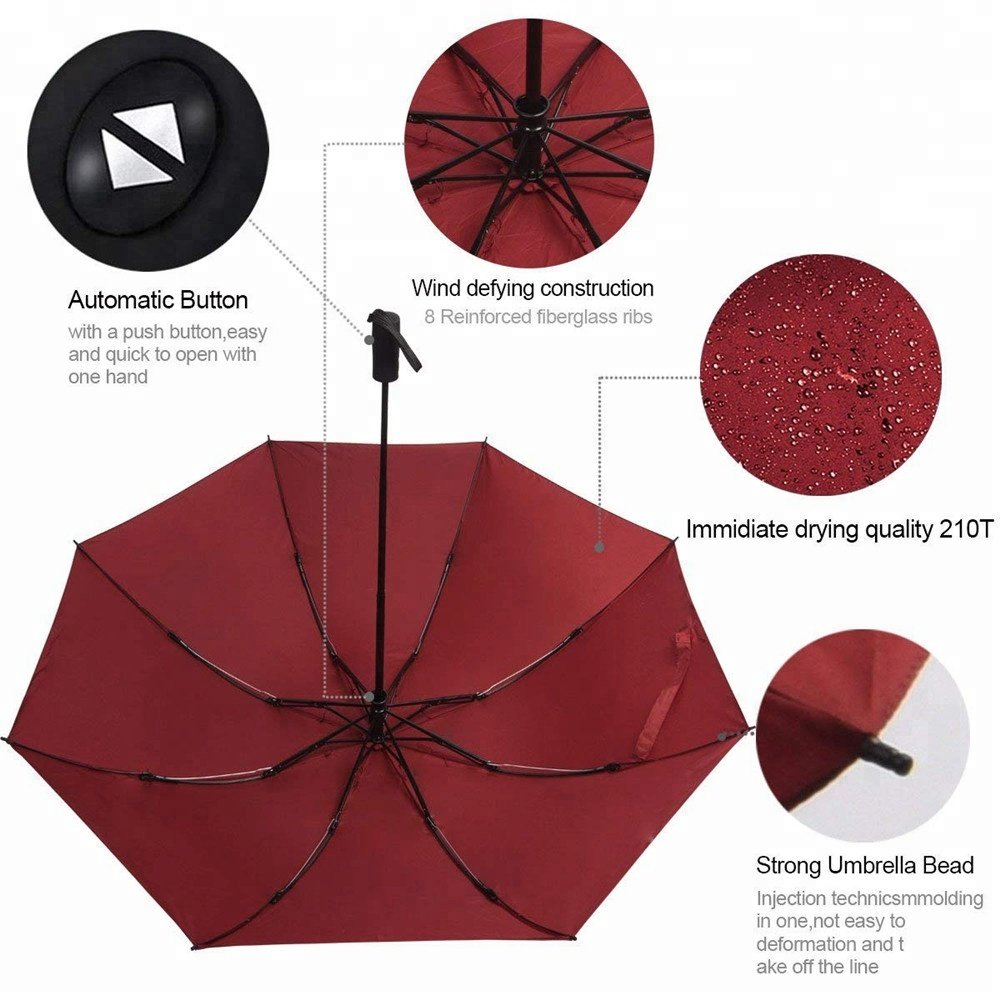 - Automatic Open and Close Umbrella: Easy to open and close, with push button auto-open and auto-close feature. This folding umbrella where you press a button and it automatically open, then close when you press it again.