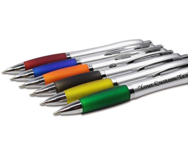 The Click-action retractable custom order pens feature stylish bright barrels with a soft-touch rubberized grip, providing superior writing stability powered by smooth-writing black ink and medium 1.0 mm point.
