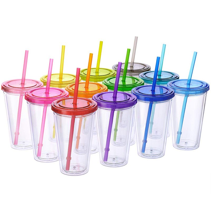 Material Plastic, Acrylic Capacity 16 oz Dimension 4″W x 9.3″H Color Clear and multi-color Features BPA-free, shatter-proof, durable, double wall, lid and straw, Leakproof Care instructions Hand wash, Machine wash Quantity Set of 12